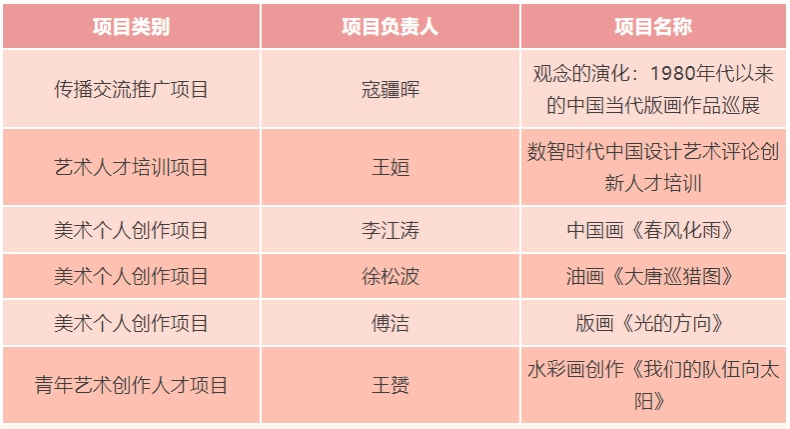 近日,国家艺术基金管理中心公示了《国家艺术基金(一般项目)2025年度资助项目名单》,天津美术学院共有6个项目获批,总金额184万元,位居天津市第一。名单如下: