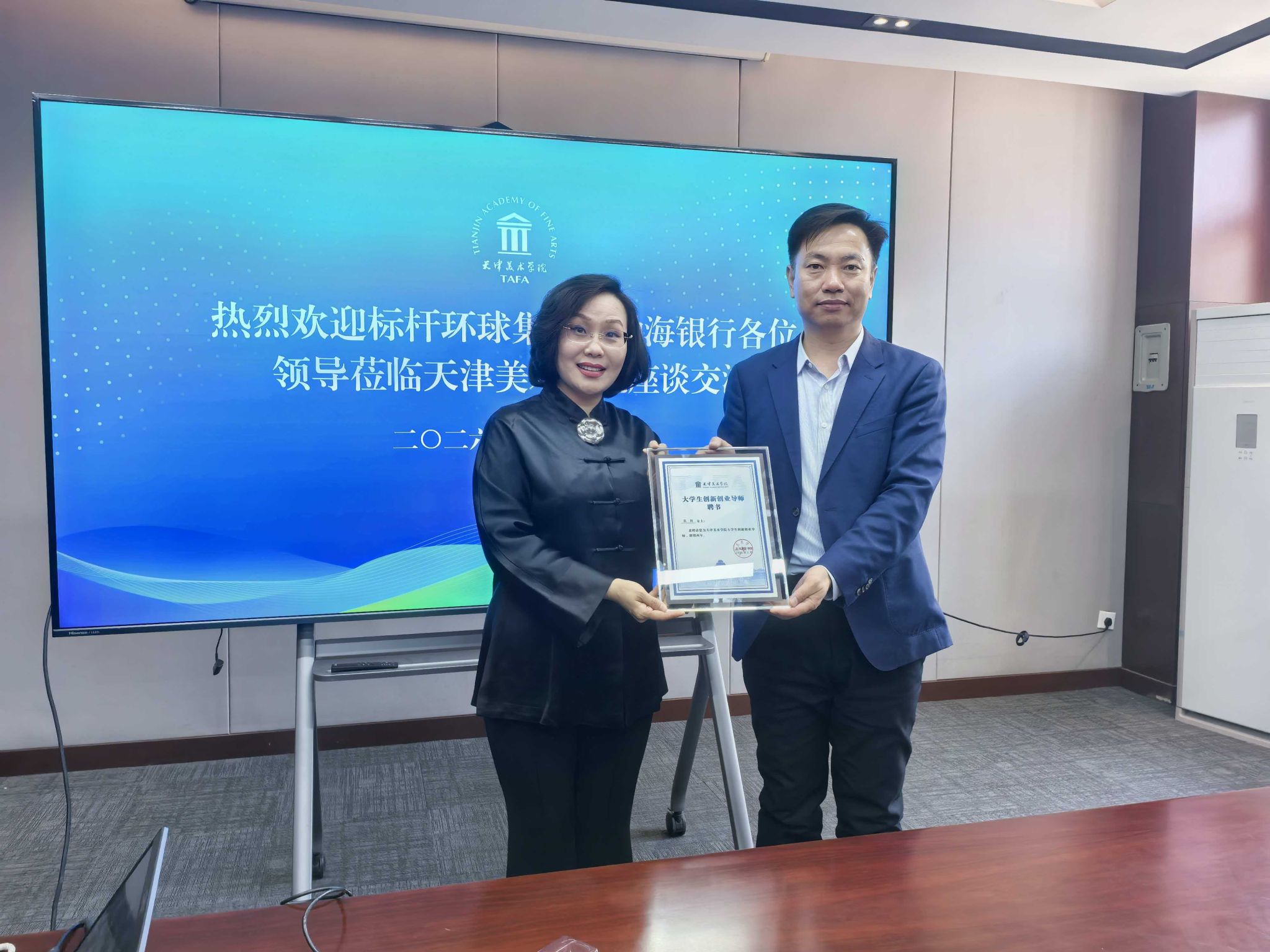座谈后举行了聘任仪式,天津美术学院正式聘任标杆环球集团首席运营官张颖为大学生创新创业导师。