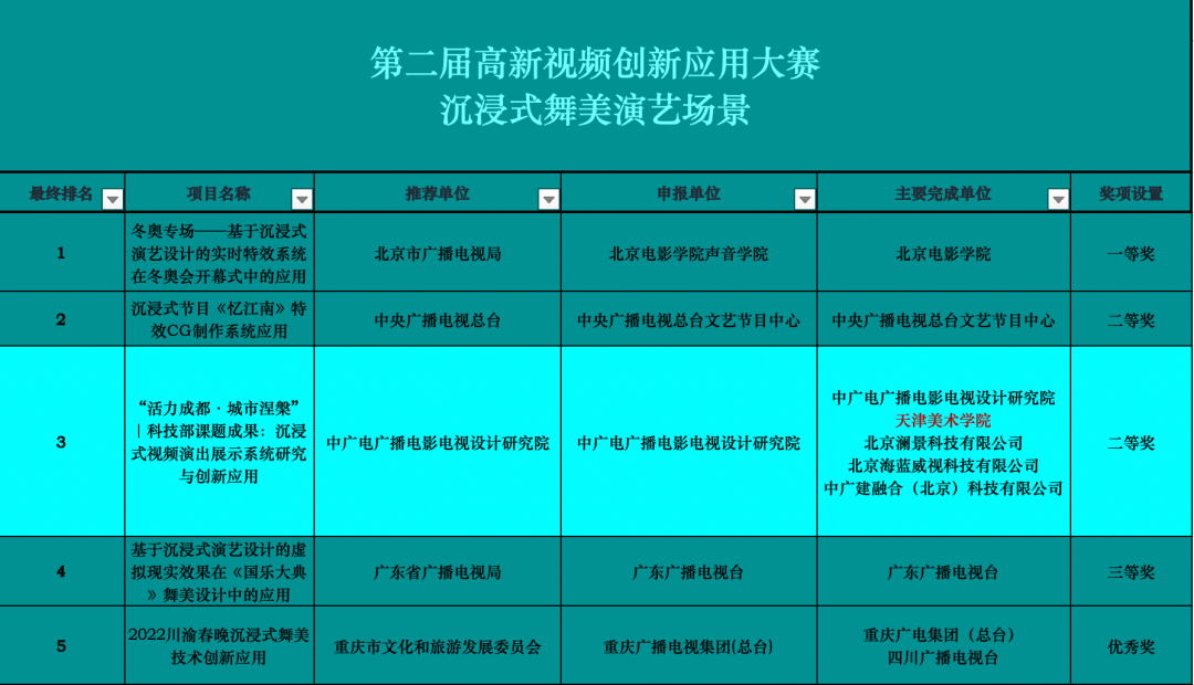 近日,国家广播电视总局办公厅关于公布“第二届高新视频创新应用大赛评选结果”。由我校作为主要完成单位的参赛项目《“活力成都·城市涅槃”|科技部课题成果:沉浸式视频演出展示系统研究与创新应用》获得“沉浸式舞美演艺场景”赛道二等奖。