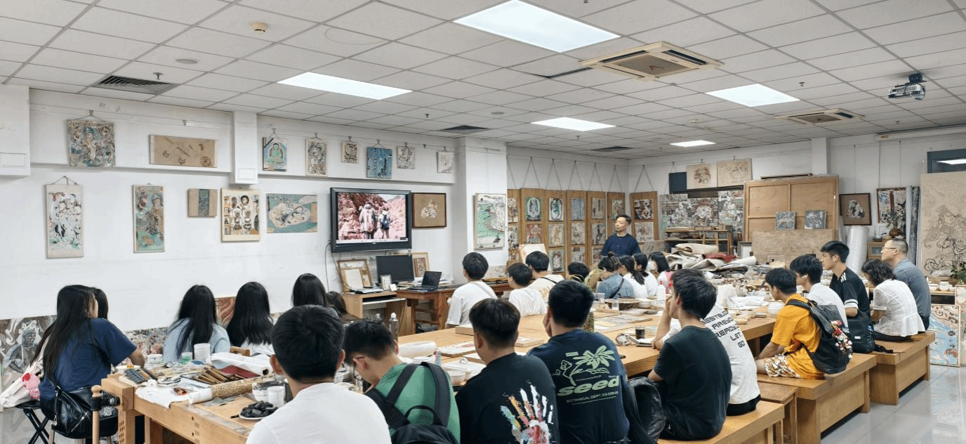 最后,交流团参观了我校的美术学国家级实验教学示范中心—中国画实验室(重彩壁画实验室)。赵栗晖教授向同学们介绍了天美师生在敦煌实地考察的经历以及敦煌壁画对当代中国画创作的影响与启示。在这里,学生们近距离欣赏了敦煌壁画的精髓,详细了解了古代壁画矿物颜料以及泥坯结构等传统工艺。同学们纷纷表示,这种沉浸式的艺术体验让他们在内心种下了一颗敦煌的种子,对中华传统文物的保护与传承有了更深的认识。