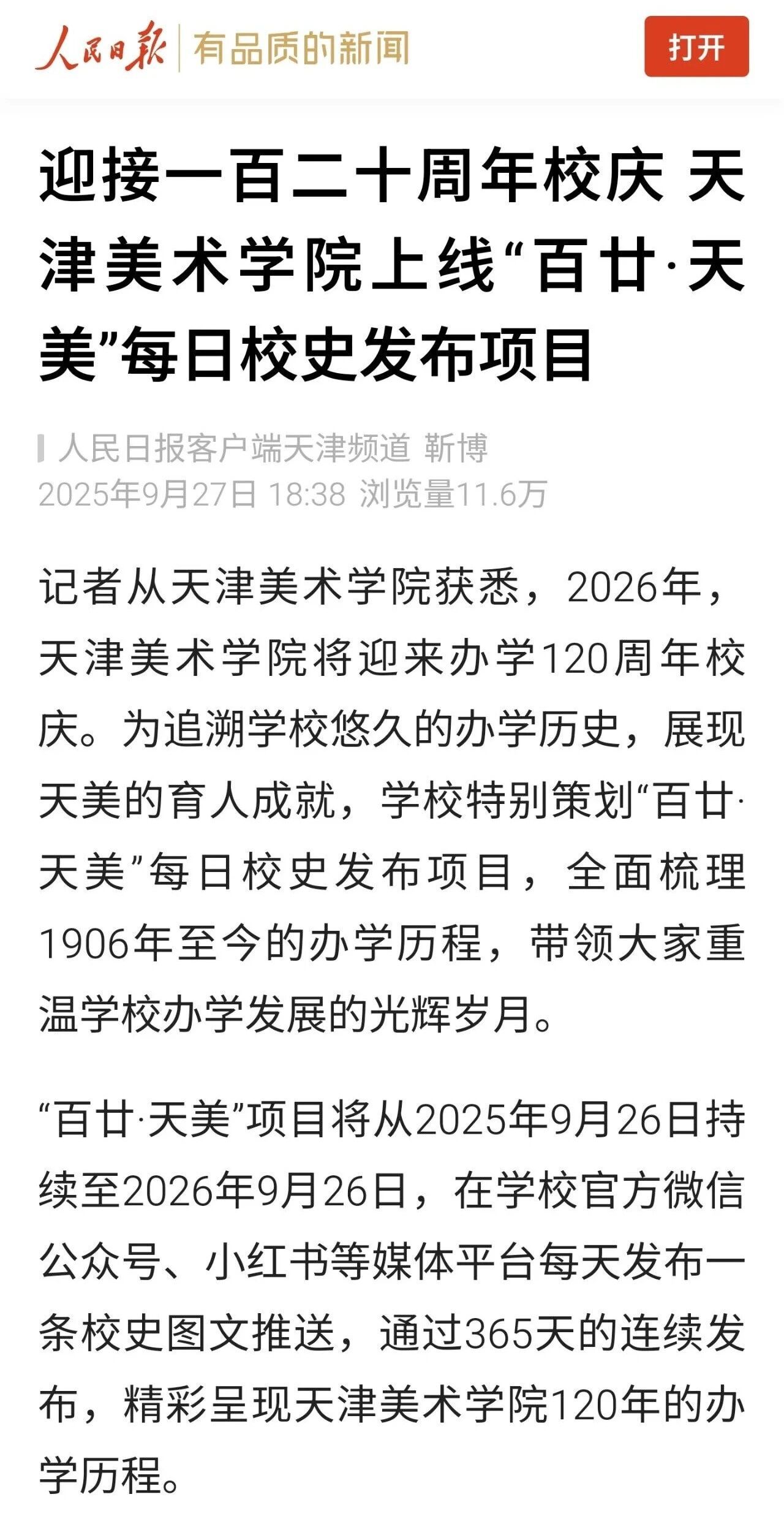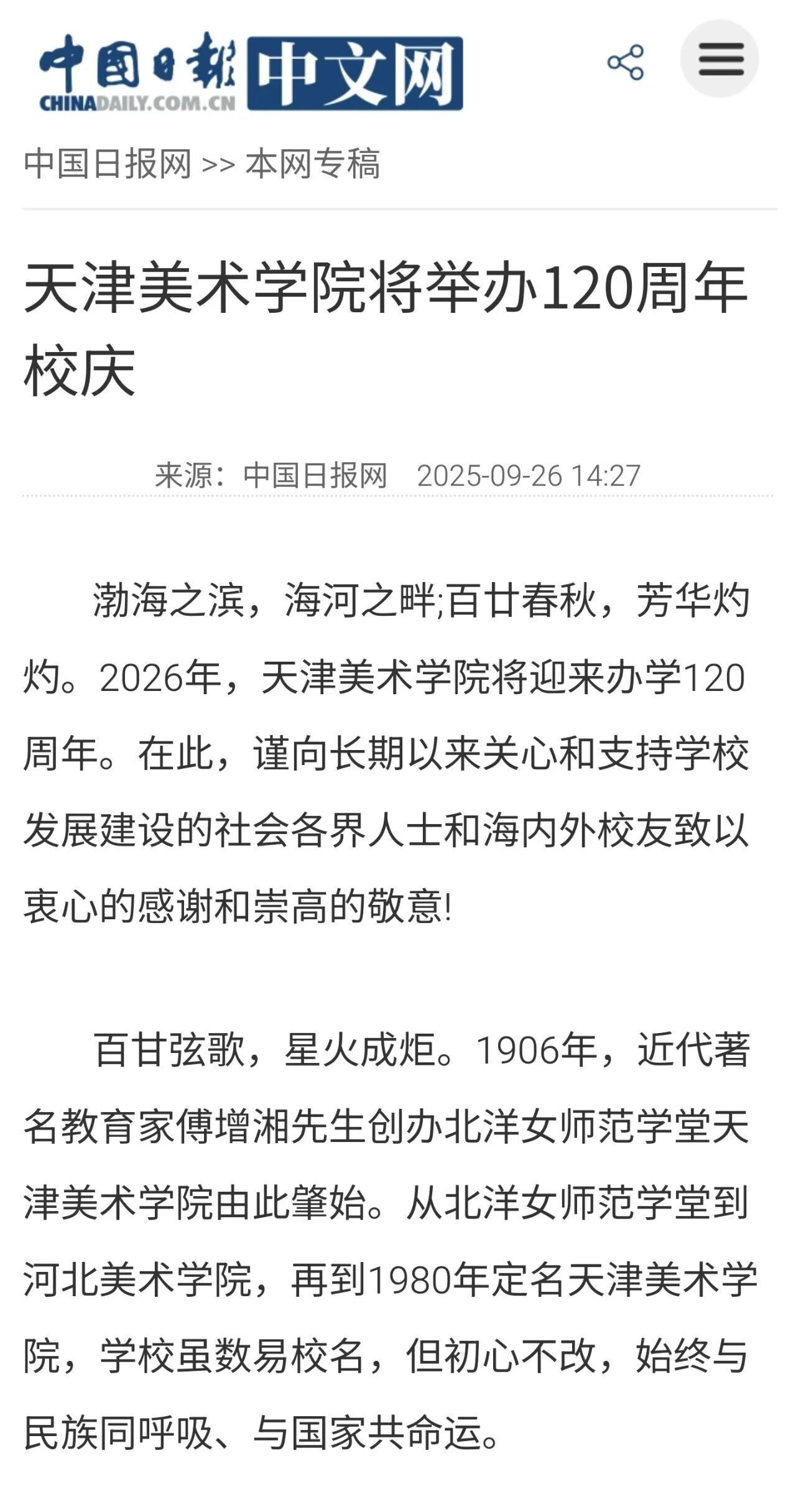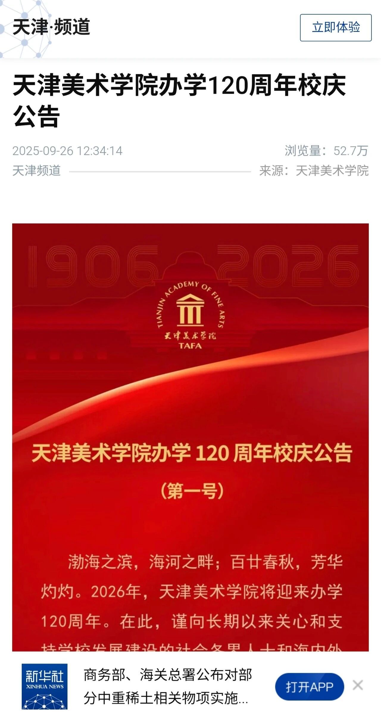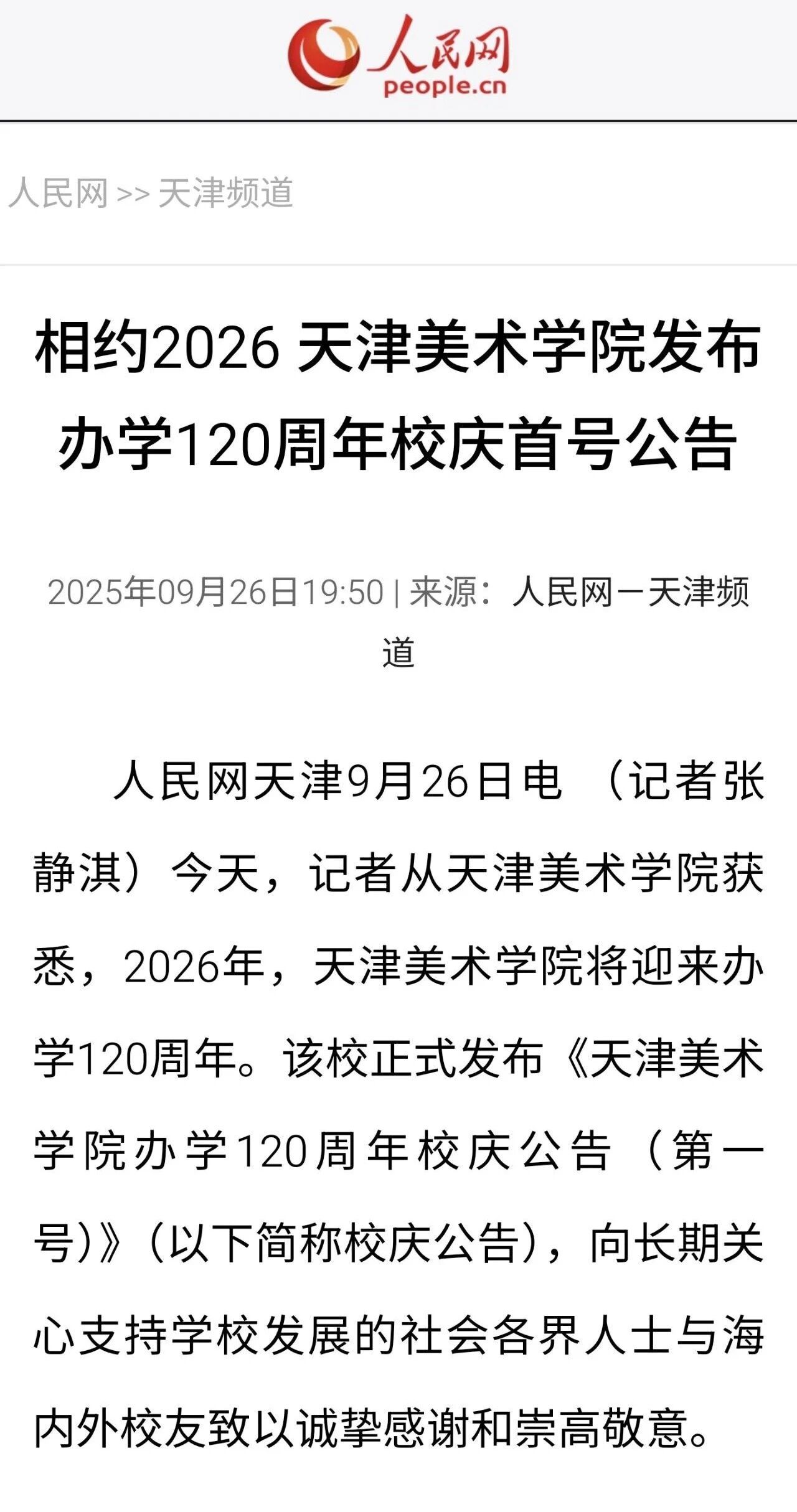 近日,我校正式发布《天津美术学院办学120周年校庆公告(第一号)》,向社会各界和全球校友致以诚挚感谢,并发出明年共庆华诞、共谋发展的盛情邀约。公告一经发布,立即获得人民日报、新华社、人民网、中国日报等中央主流媒体的广泛关注和转发报道,浏览量超百万。站在办学120周年的历史节点上,学校将以百廿校庆为契机,全面总结办学经验,凝聚各方力量,开启建设高水平美术学院的新征程。