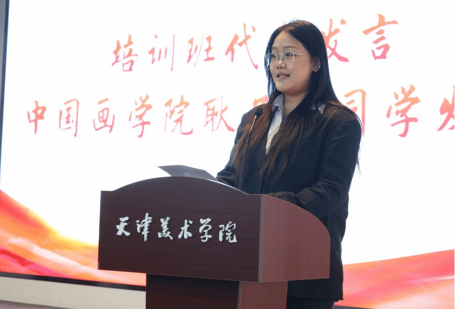 中国画学院2023级研究生、西部计划志愿者耿子瑜同学作为培训班学员代表发言,她结合西部计划的志愿服务经历,表示将牢记习近平总书记对青年的嘱托,以党员标准严格要求自己,在理论学习与艺术实践中锤炼党性,发挥先锋模范作用,把青春奋斗融入党和人民的事业,践行“强国有我”的青春誓言。