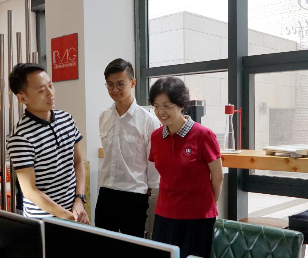 在GENSBOX众创空间,程丽华书记一行听取了党委学工部负责同志对我校大学生创新创业特点、众创空间功能建设和阶段性成果的介绍,深入与天津市黑葱科技有限公司、天津地平线画院和贝格万象科技有限责任公司三支学生创业团队负责人亲切交流,了解团队创新创业情况,并对我校创新创业工作给予了充分肯定。