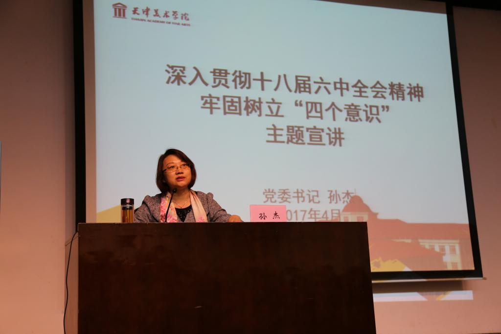2017年4月18日下午,校党委书记孙杰为全体党员做《深入贯彻十八届六中全会精神,牢固树立“四个意识”》主题宣讲,我校全体在职教工党员、全体处级干部、离退休党员代表和学生党员参加了宣讲学习活动。