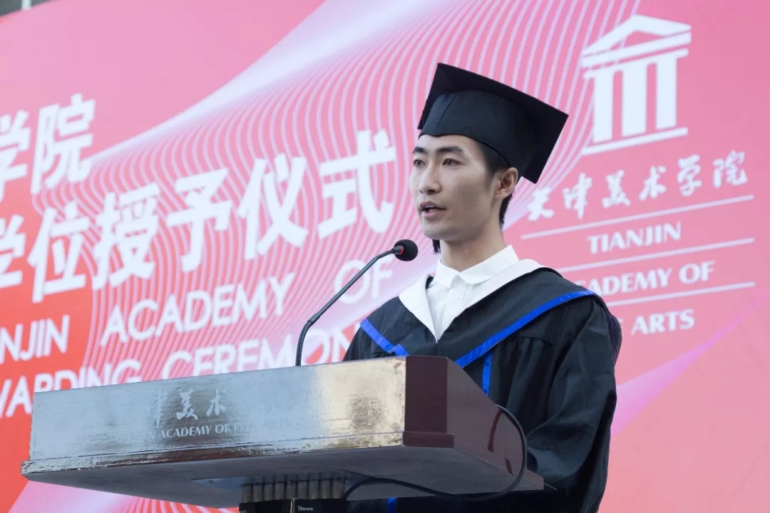 颁奖结束后,2018届“天津美术学院院长奖”获得者,团中央第二十届研究生支教团成员、实验艺术学院2014级移动媒体艺术系的张澜涛同学代表全体毕业生发言,他与全体毕业生分享了四年美院求学生涯的体会和收获,并由衷感谢老师们谆谆教诲、感谢同学们的一路陪伴,并祝福母校和毕业生们拥有更加美好的未来。