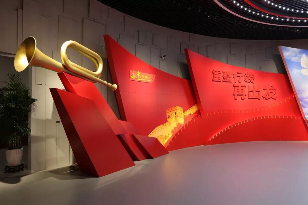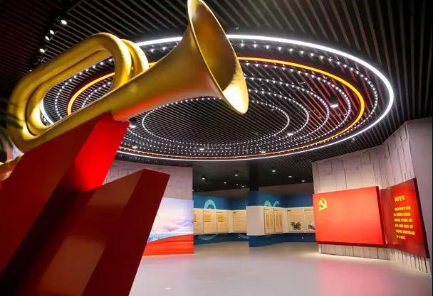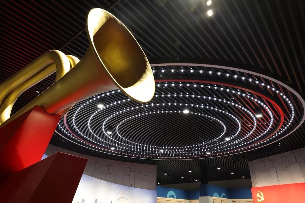 尾厅设有党旗、号角等造型。寓意党的十九大吹响了新时代的进军号角。广大党员干部要“不忘初心,继续前进”,在以习近平同志为核心的党中央坚强领导下,汇聚起同心共筑中国梦的磅礴力量,书写新时代中国特色社会主义事业的辉煌篇章。