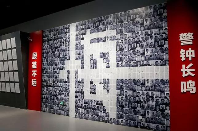 以严重违纪违法人员照片、忏悔书拼接形成,寓意殷鉴不远、警钟长鸣。