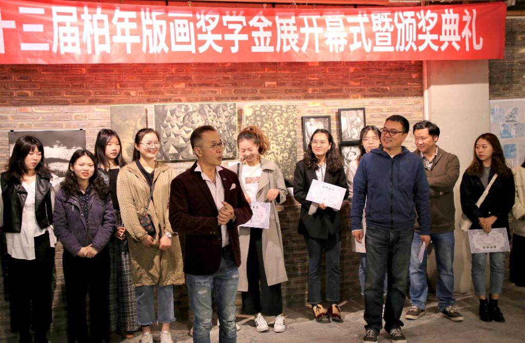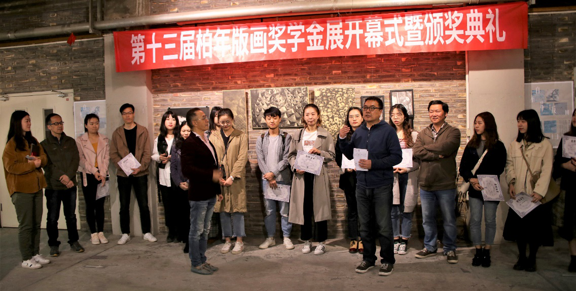 2019年4月22日上午10:00,造型艺术学院版画系第十三届“柏年版画”奖学金展开幕式暨颁奖仪式在版画实验室圆厅举行。出席本次开幕式暨颁奖仪式的有柏年基金会主席王柏年先生,版画系主任郭鉴文,教师熊永平、石磊、周路、王琛琛以及第十三届“柏年版画”奖学金全部参展学生。