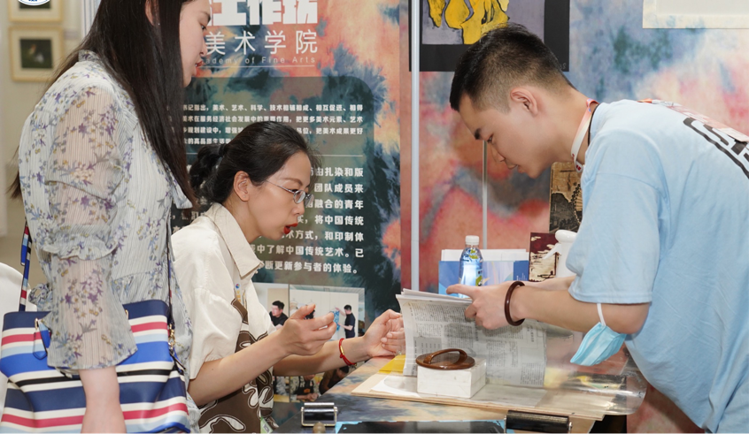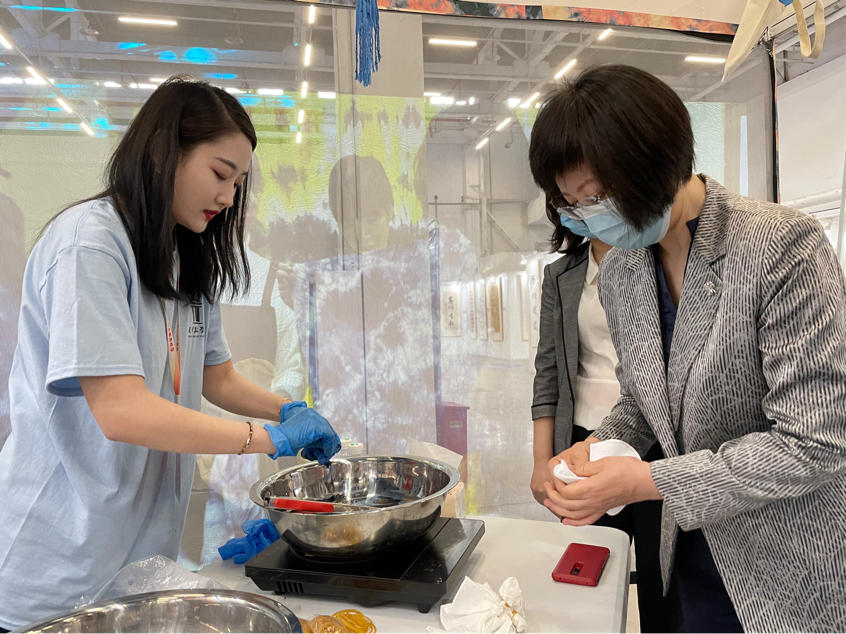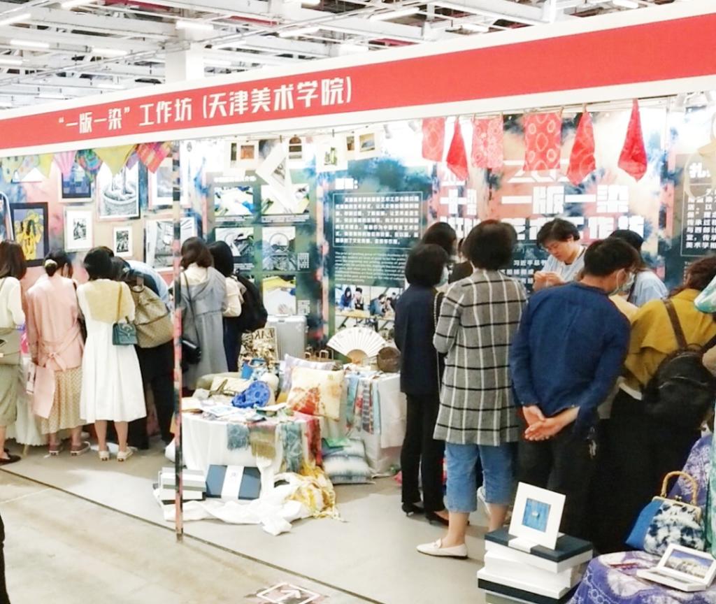 在本次展演中,我校“一版一染”艺术实践工作坊团队分别设置了“一版一染”艺术作品展示区、“一版一染”文创展示区和版画扎染体验区,以“红色精神”和“大美中国”为出发点,传承中华传统文化精神,践行环保理念,采用轻量材料,佐以全息投影的影像展示,将展厅装饰打造成沉浸式体验展览区。观众可以在参观和体验的过程中感受非物质文化遗产的博大精深和艺术与生活深度结合的良好体验。