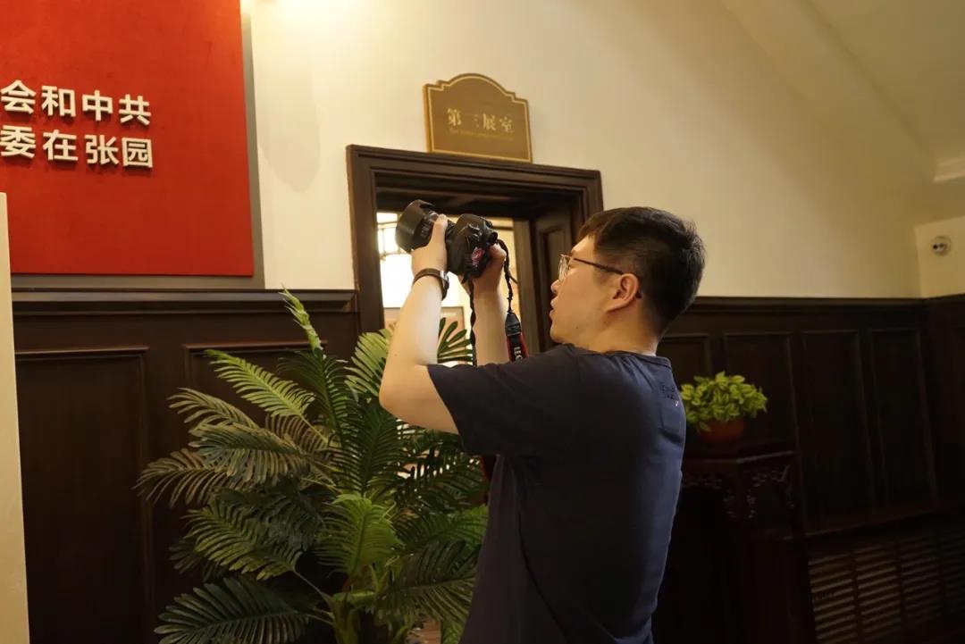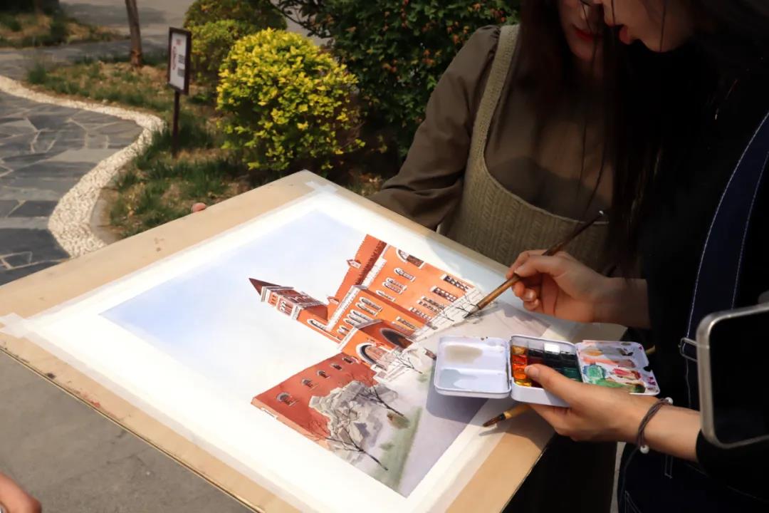 在张园(天津军管会、中共天津市委旧址)参观时,杨春扬老师为学生们详细讲述了“张园”名字的由来和这座名园百余年的历史,讲述了孙中山先生北上于此园,与于方舟、马千里等人共商中国革命和建设的故事;王金阳老师带领学生们一边参观一边细数天津解放后,军事管委会、中共天津市委、天津日报社等曾在此办公的经历,回顾了那段峥嵘的历史岁月。随后共同指导学生们将革命遗迹的“红色印记”融入手绘作品,学生们拿起画笔和相机,用绘画、摄影、短视频、新媒体等多种创作形式记录历史,讲述历史,传承历史。