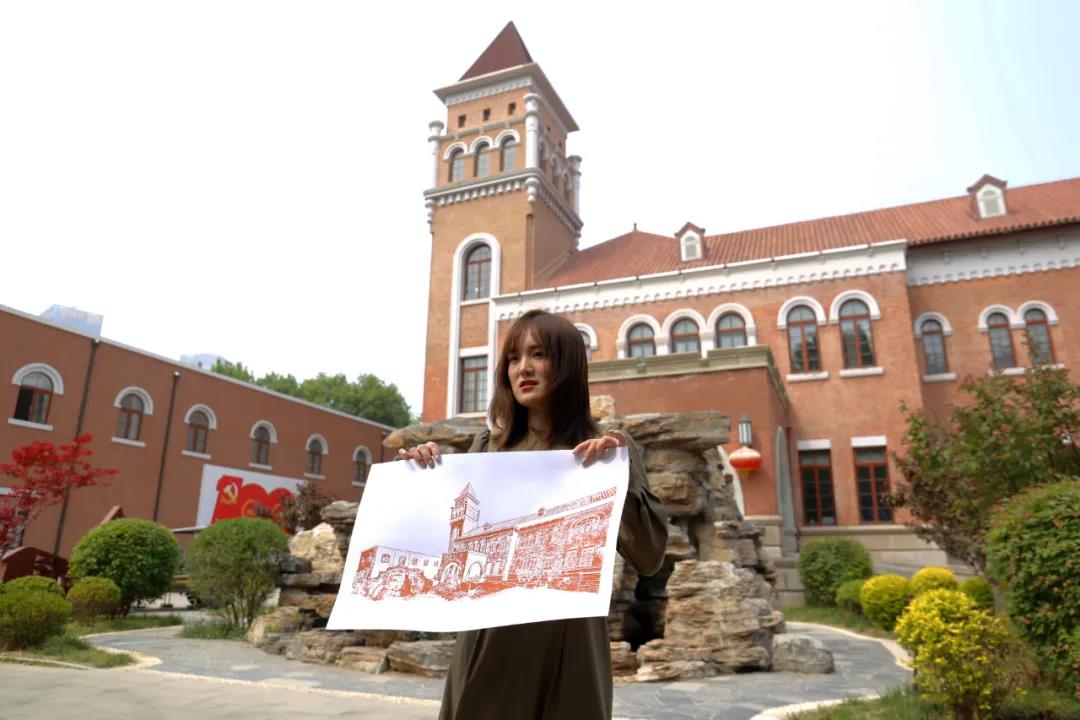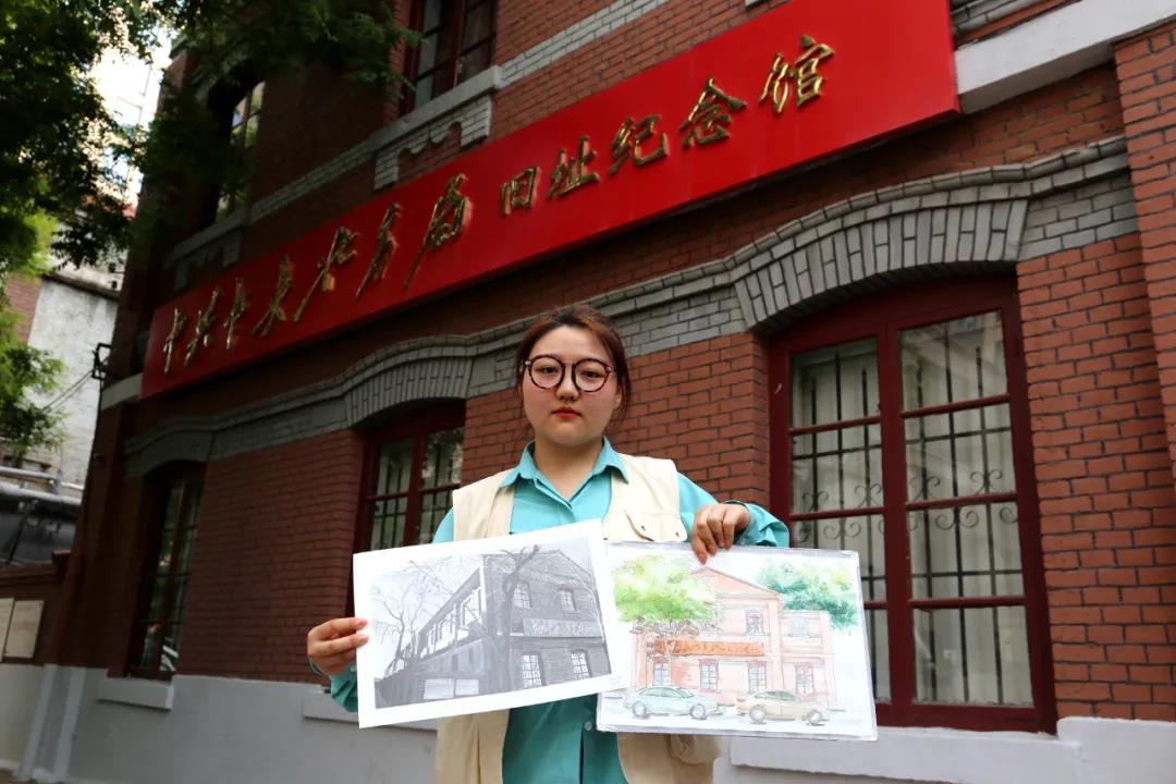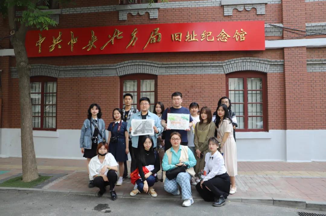 在中共中央北方局旧址开展实践活动时,杨春扬老师带领学生参观了刘少奇同志任北方局书记期间住过的地方,对同学们尤其感兴趣的“惠兴德成衣局”进行了介绍,同学们对当年刘少奇同志受党中央委派秘密来津,租住这件裁缝铺的故事有了更深入的了解。与此同时,王金阳老师指导融媒体工作室的同学们将手绘创作过程和活动现场进行了采访和录制,为手绘活动在新媒体平台的报道和展播积累生动素材。同学们在现场手绘和采访时,也吸引了大量游人围观,对我校学子的绘画作品和躬身践行党史学习教育纷纷表示赞叹。