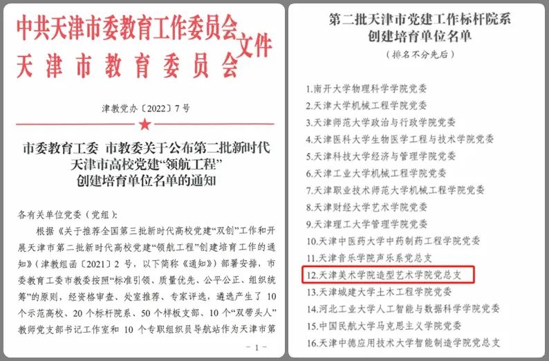 日前,天津市委教育工委市教委下发了《关于公布第二批新时代天津市高校党建“领航工程”创建培育单位名单的通知》,公布了第二批天津市高校党建“领航工程”评审结果。经过资格审查、工委处室推荐、专家评选等环节,我校造型艺术学院党总支获批第二批天津市党建工作标杆院系创建培育单位,视觉设计与手工艺术学院研究生党支部获批第二批天津市党建工作样板支部创建培育单位。创建培育时间至2023年12月。