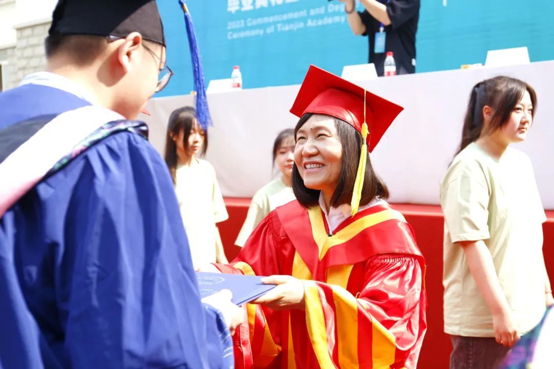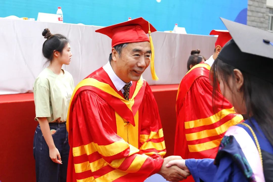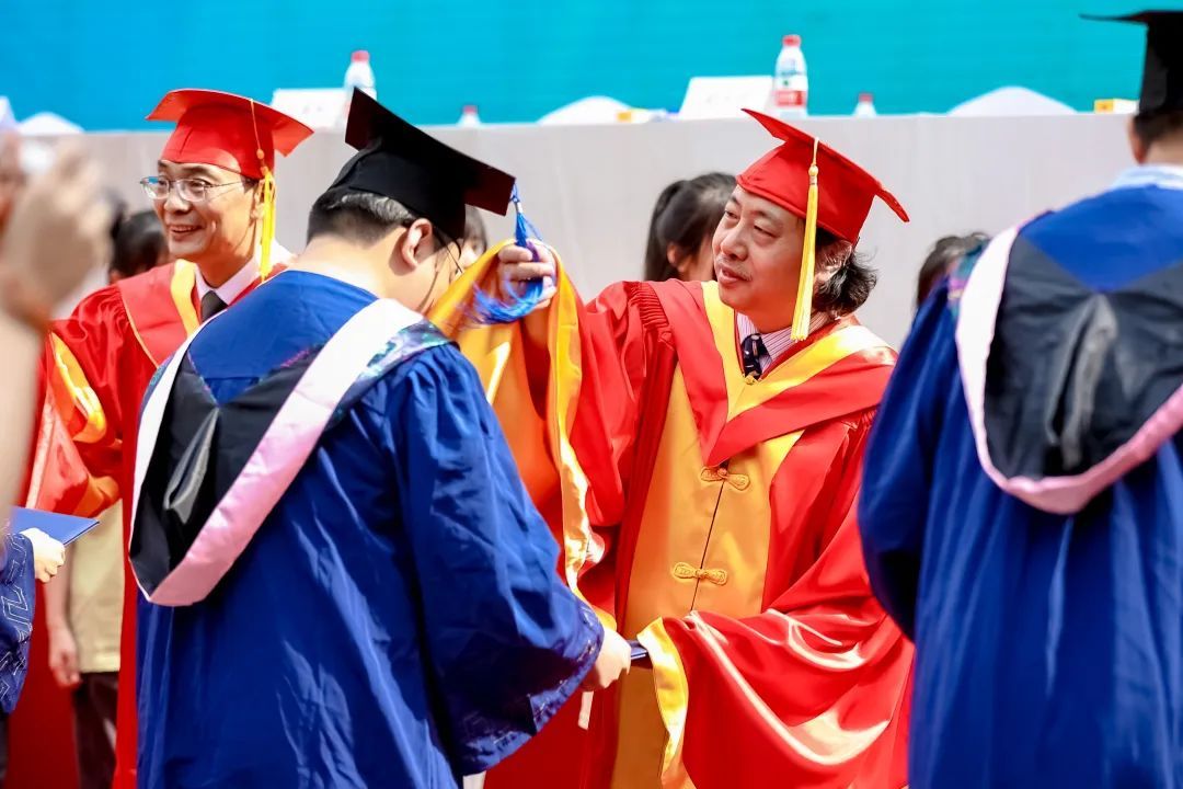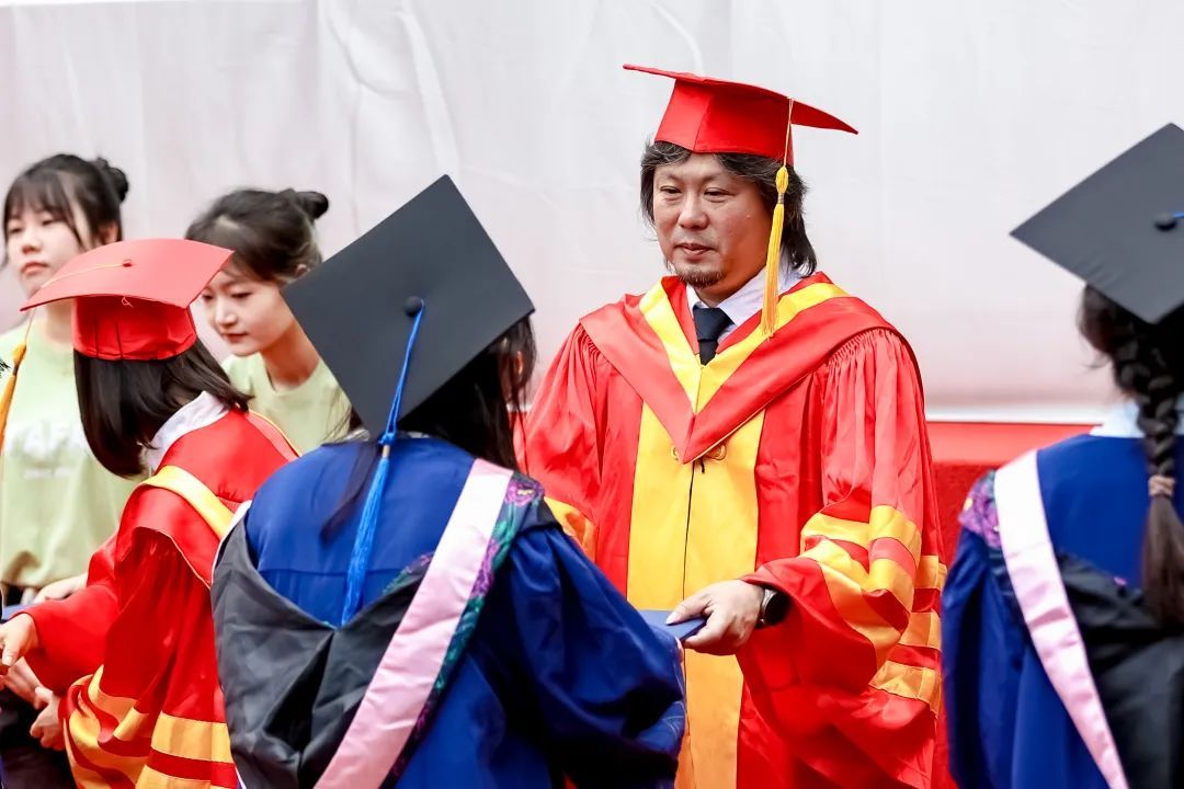 党委副书记、院长贾广健发表了热情洋溢的讲话。他代表学校,向完成学业、圆满毕业的2023届全体毕业生同学和十位去年未在现场参加学位授予仪式的2022届毕业生同学表示热烈的祝贺。贾广健讲到,2023年注定是值得铭记的一年,三年磨砺、四年青春,越过激流险滩,战胜艰难困阻,最难熬的日子都是我们一起坚守、携手共进挺过来的。当毕业的骊歌在校园响起,当毕业大展在天津美术馆、天津滨海美术馆、天津美术学院美术馆同时拉开帷幕,天美学子以华服织就天马行空,以科技点亮艺术之光,以设计展现时代新象,凸显着我们天美学子的青春活力和艺术创造力。天美在见证了你们最美好的青春时光的同时,也伴随着你们的成长而不断发展。希望同学们做到抱朴求真,砥砺奋进,以“厚德之行、大美之艺”的文化内涵为精神载体,表达对艺术、对生活、对人生的纯粹热爱和对可爱中国的深情热望;希望同学们能够学思践悟,进而有为,永怀“崇德尚艺 力学力行”的校训精神,以更充沛的勇气与智慧、更强大的耐心与定力,学习新思想、掌握新本领、展现新作为;希望同学们可以启智润心,乘风破浪,在不断地学习和工作中淬炼情怀,用更笃定的力量去迎接挑战,用更专注的学习去成长突破,带着对未来的无所畏惧迈向心中的未来。祝福2023届全体毕业生,飞云踏海、骑鲸逐梦,再见少年拉满弓,不惧岁月不惧风。听风沐雨,静心以对,染就一树芳华。
