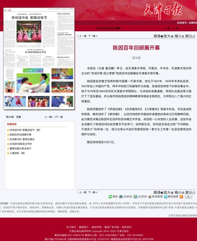 本报讯(记者 翟志鹏)昨日,由天津美术学院、市美协、市书协、天津美术馆共同主办的“赤诚丹青 因之寥廓”陈因百年回顾展在天津美术馆开幕。
