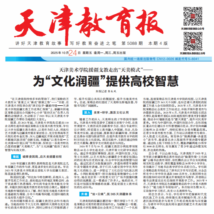 在学校“十四五”发展蓝图中,援疆支教工作作为一项彰显社会责任与使命担当的重要举措,不仅是对国家号召的积极响应,更是对学校自身教学理念、育人成果的生动诠释与深度检验。自2021年以来,天津美术学院教育援疆从“单点派遣”向“系统推进”深度转化,有效对接学校专业优势与地方实际需求,以支教团为纽带,形成了融合“情”“育”“艺”的“天美模式”。《天津教育报》深度报道,并在头版头条刊发。天津美术学院援疆支教走出“天美模式”...